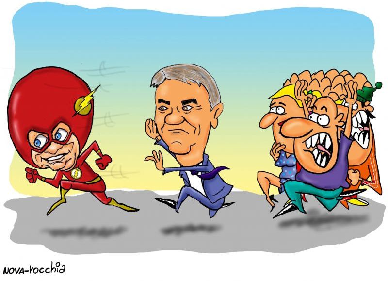 El presidente Javier Milei visitó fugazmente la provincia, dialogó con el gobernador Leandro Zdero y dejó enardecida a una multitud que pelea por política. (Dibujo: NOVA)
