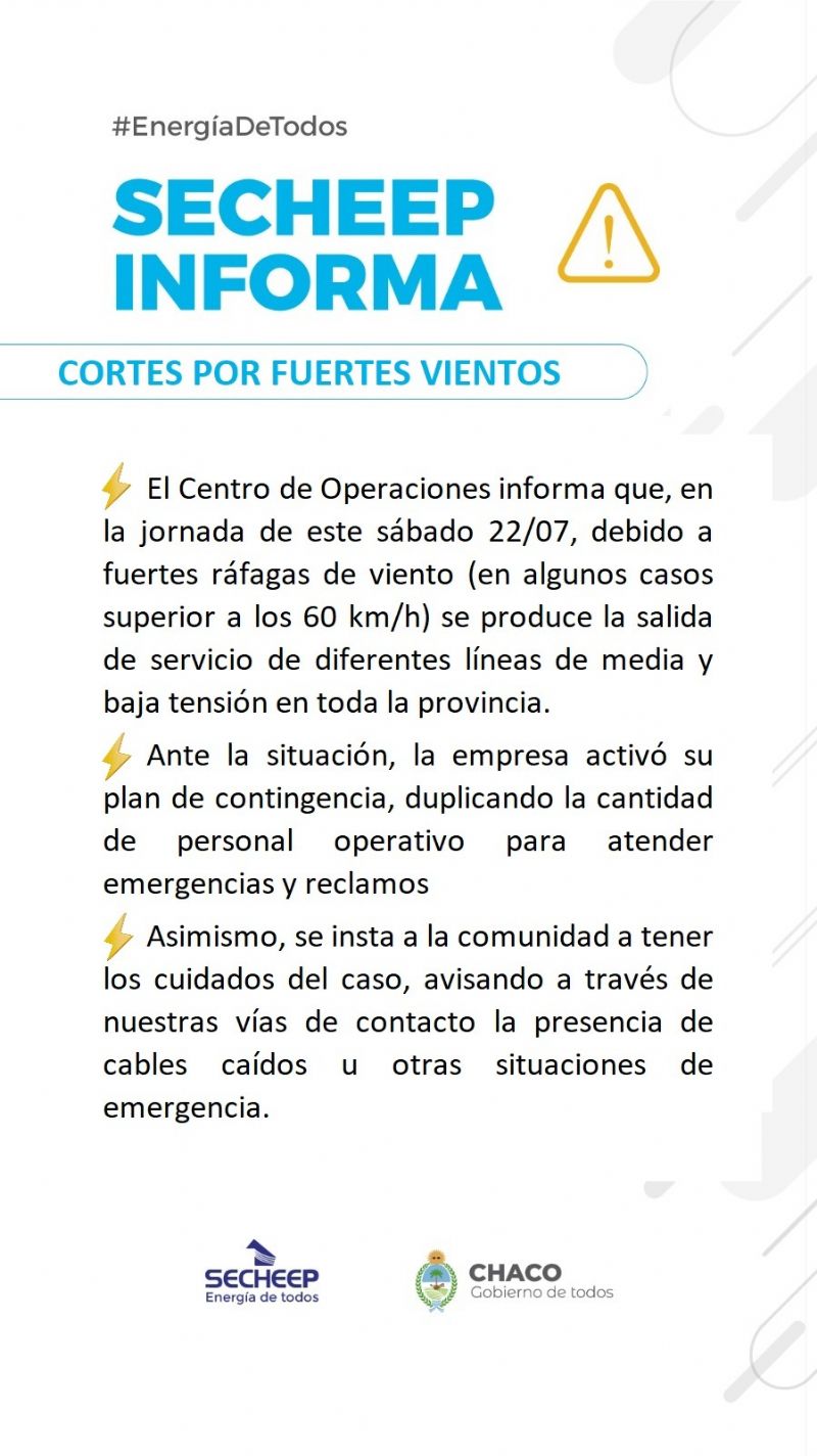El Centro de Operaciones de Secheep informa que, en la jornada de este sábado 22/07, debido a fuertes ráfagas de viento (en algunos casos superior a los 60 km/h) se produce la salida de servicio de diferentes líneas de media y baja tensión en toda la provincia.